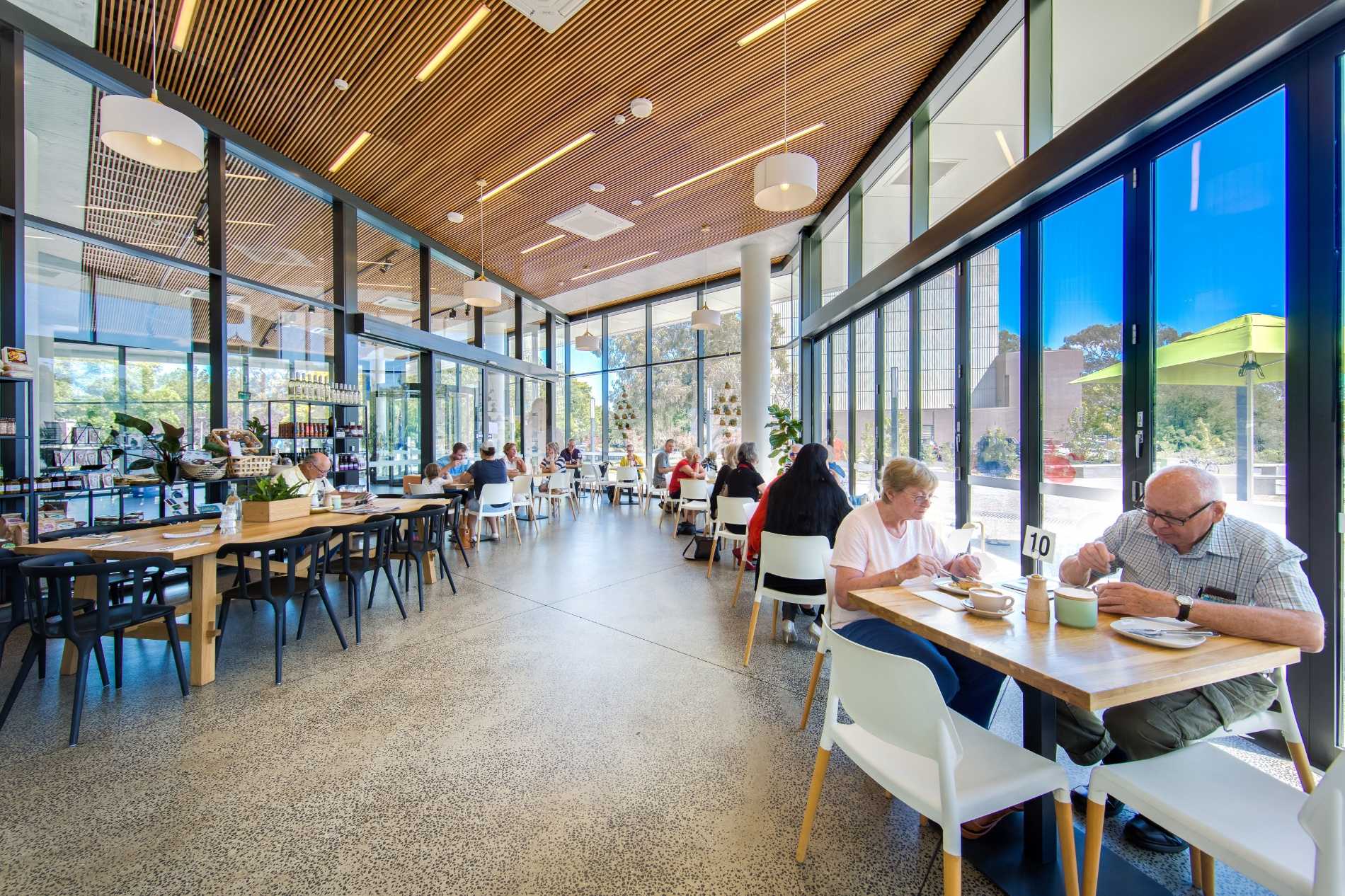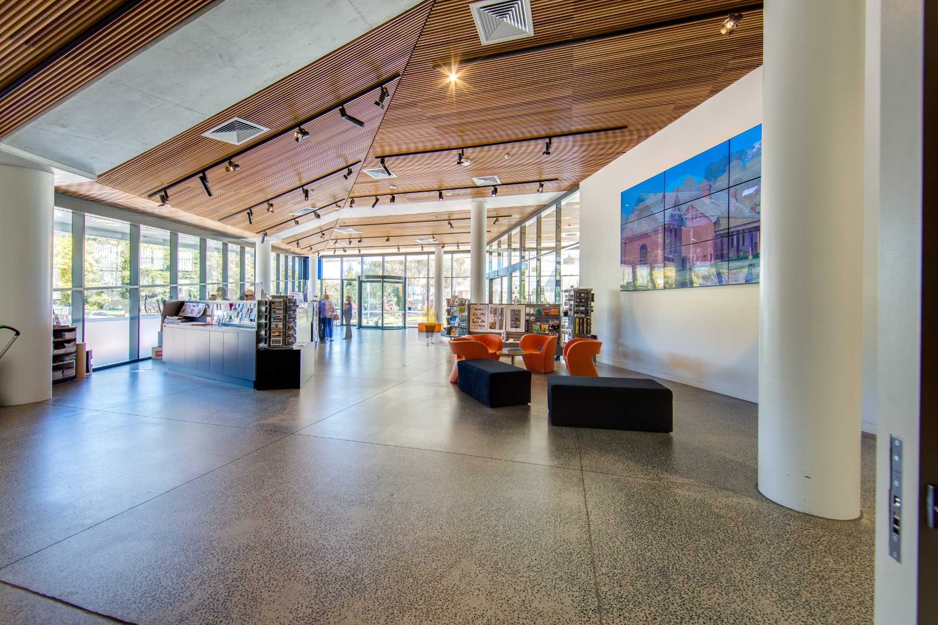 Beneath, the regional museum includes a visitor information centre, café and museum space. Full-height glazing with polished concrete floors are brought together with feature post-form concrete elements, acoustic design and feature lighting elements to ensure visitors enjoy the space to it’s full.