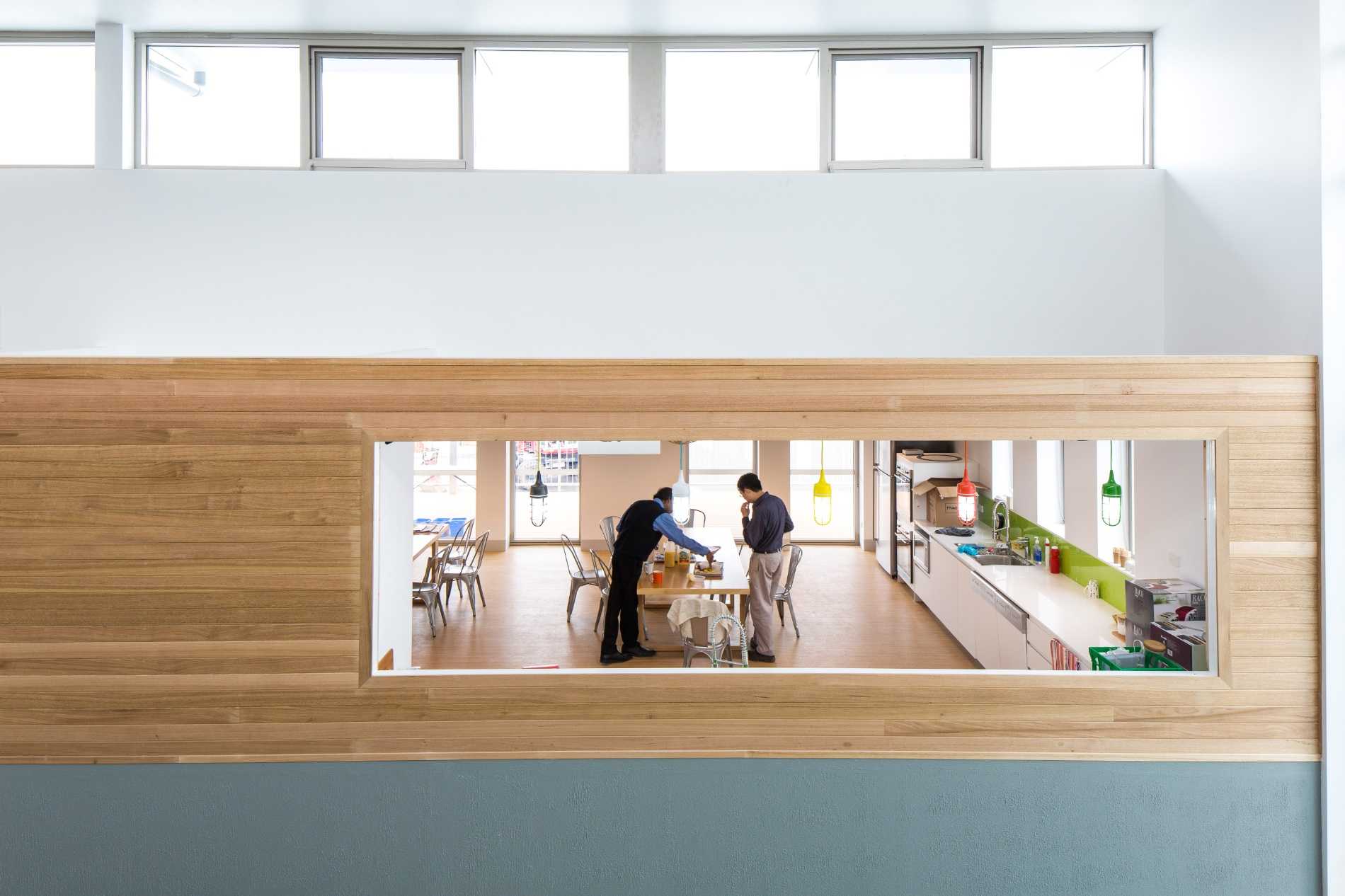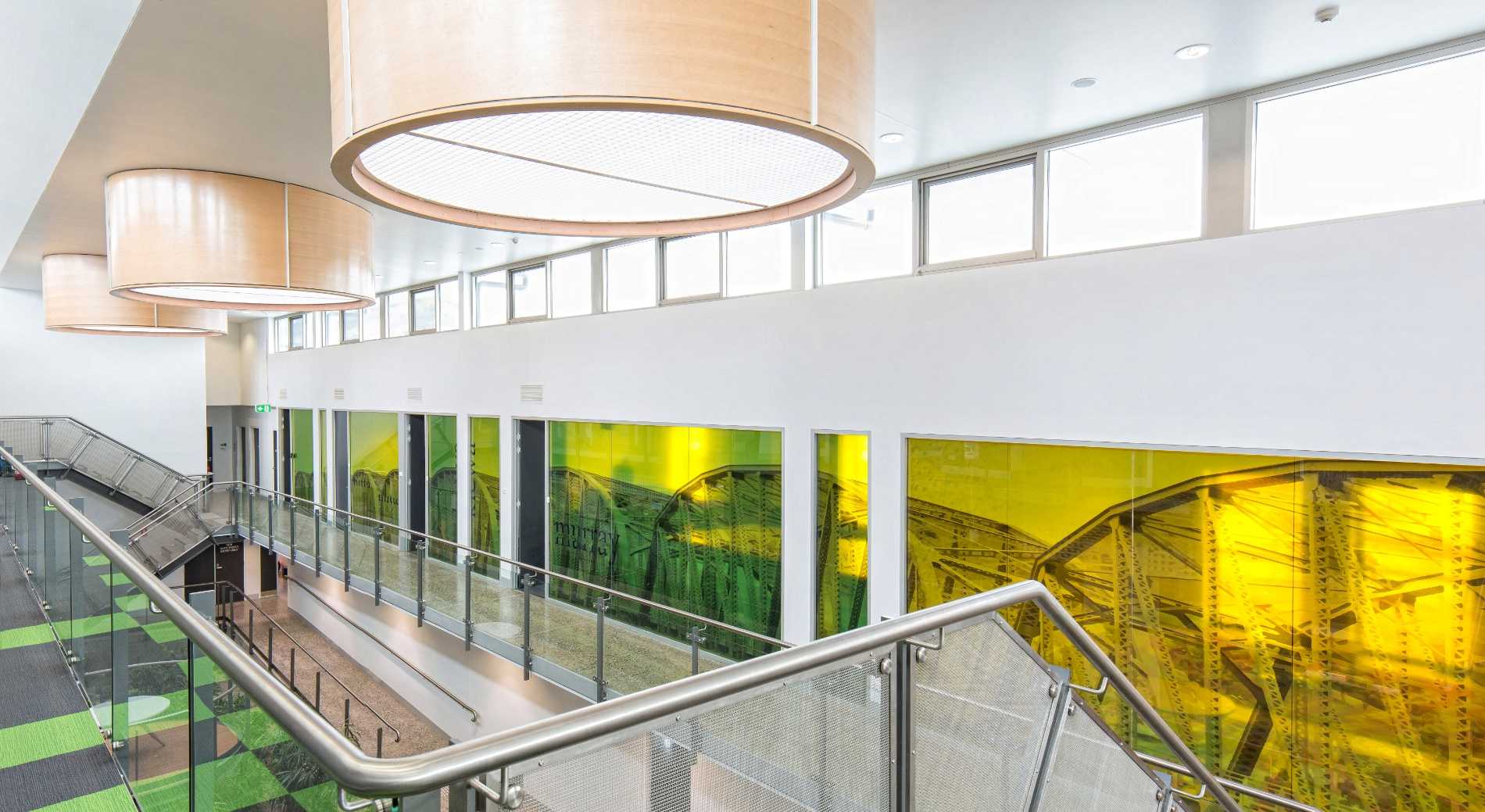 Curved ply to the first floor skylights fills both levels with natural light, while screen printed glazing of local water sources connects the delivered building to the community it’s occupants serve.